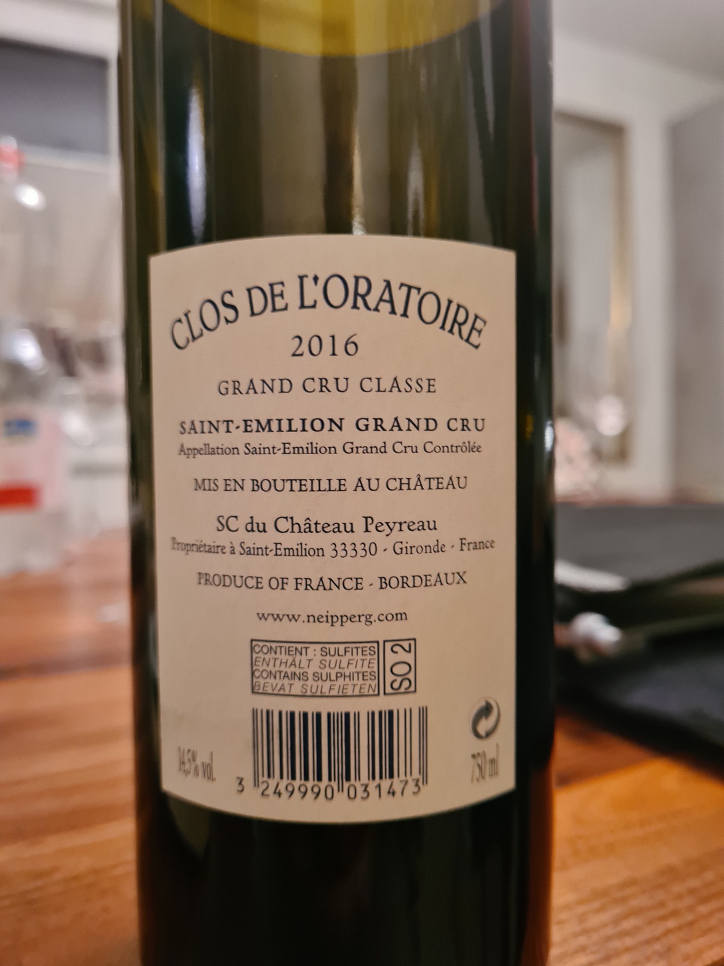 | 2016 | Clos de l’Oratoire Grand Cru Classe Saint-Emilion AOC. 14,5Vol%Alc. Ernte 10. bis 17. Oktober 2016. Ertrag 49 hl/ha. Assemblage 90% Merlot und 10% Cabernet Franc. Ausbau 14 Monate in Barriques, davon 45% neue. Abgefüllt am 19- + 21- März 2018. Tief dunkles Kirschrot. Das Bouquet kompakt, etwas verhalten aber mit einem guten Mix von Frucht, Holz und guter Süsse. Auch im Gaumen zeigt er sich kompakt, kräftig, säurestark, eher als kühler Wein zu empfinden und mit sehr präsenten Röstaromen. Er verlangt noch Reifezeit, sollte also noch 5 bis 10 Jahre im Keller liegen. Bewertung anderer: James Suckling Vorabzug 94-95/100, CH Weinzeitung Vorabzug 17/20. Am 23-09-2023 17/20 aus dem Definition/Burgund/Spiegelau-Glas. Martin SUTTER. |