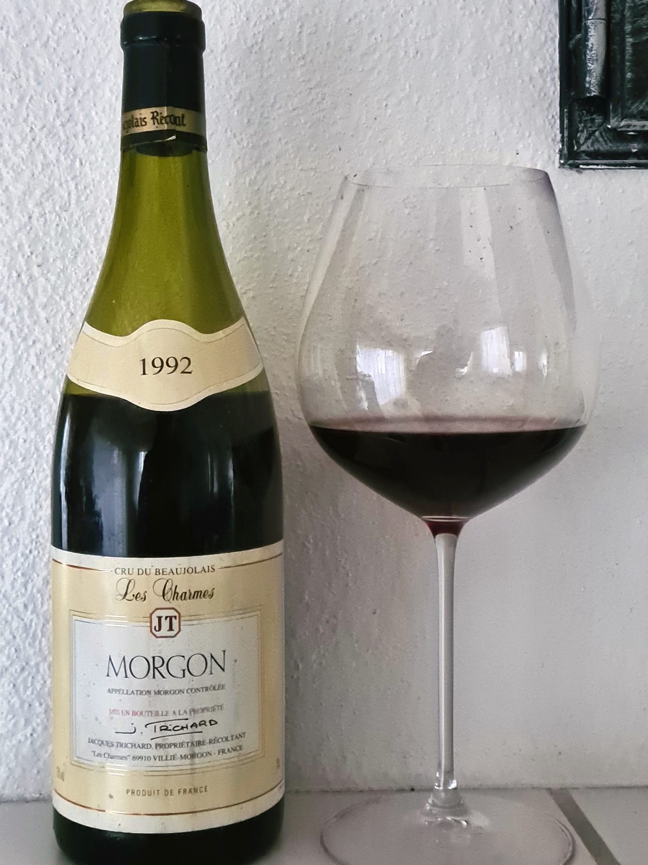 Die Domaine ist über die Rue Grange Cochard zu erreichen, die vermutlich mehr im Navi zu finden ist, als Les Charmes und Les Pillets. Jacques Trichard und Frank Chinquin, waren 1995 für mich im Beaujolais die Top-Adressen für gute Weine aus dieser Region. All die anderen hoch gepriesenen Namen wie Château Thivin, oder die Domaine Descombes, hielten vor allem über die Jahre gegen die zwei kleinen Winzer nicht stand. Bei Jacques wird wohl der Betrieb verkauft wenn die Rente naht, seinen Sohn, habe ich noch „musikverrückt“ gemacht, er arbeitet jetzt bei Sony in Paris. Bei Chinquin wird sein Sohn, der dem Vater wie aus dem Gesicht geschnitten ist, das Zepter übernehmen. Jacques Trichard hat seinen Betrieb eingestellt. Was für ein Verlust für die Gemeinde Morgon.