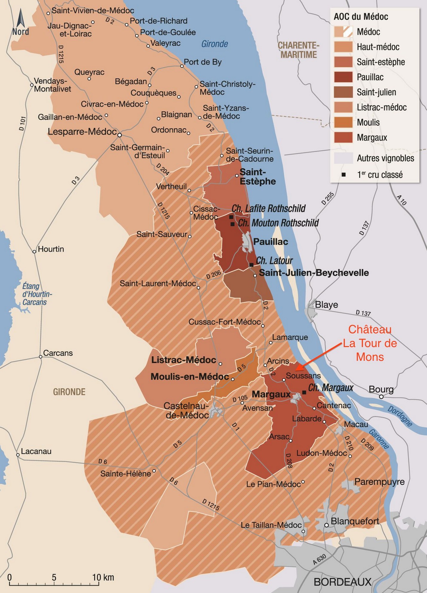 Nicht selbstverständlich ist die Tatsache, dass die 58 Hektar Reben von Château La Tour de Mons, am Stück sind. Dies bringt Vorteile bei der Ernte, z.B. kurze Anfahrt zur Verarbeitung der Trauben. Bei heissem Wetter ist dies noch wichtiger. Das Château selber wurde im 13. Jahrhundert erbaut, der Namensgeber hiess Pierre de Mons, er kam 1623 durch Heirat zu diesem Anwesen. Im 2020 kam dann wiederum die Familie Perrodo in den Besitz von La Tour de Mons. Der Familie Perrodo gehören auch noch die beiden Margaux Weingüter Château Labégorce und Château Marquis d’Alesme.