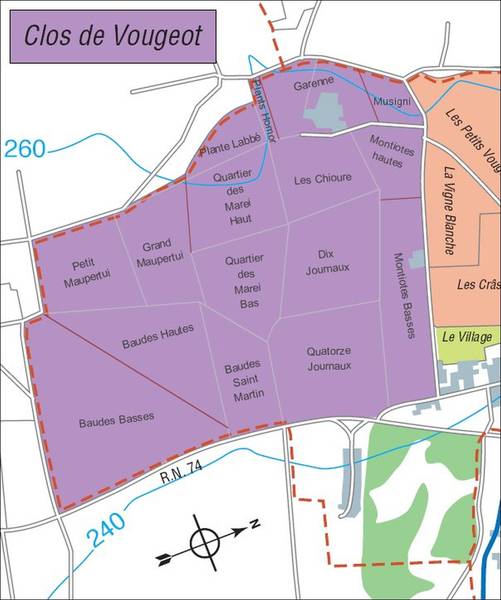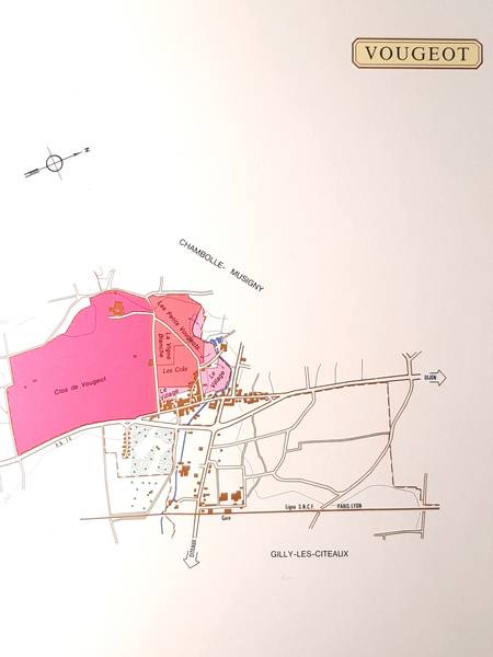 Die Gemeinde Vougeot liegt an der D974, das Dijon nördlich gelegen (19 km) mit Beaune südlich gelegen (20 km) verbindet. Vougeot liegt 237 Meter über Meer und zählte im Jahr 2017 177 Einwohner. 1936 bekam Vougeot das AOC und besitzt somit im Verhältnis zur Gemeindegrösse, die grösste Fläche an Grand Cru an der Côte d’Or. Der einzig wirkliche Anziehungspunkt in der Gemeinde jedoch, ist nur das Clos de Vougeot mit dem Château Vougeot und dem Château La Tour Vougeot. Vougeot wird aber eigentlich mehr durchfahren, um nach Chambolle-Musigny oder zum Château de Gilly zu gelangen. Clos de Vougeot grenzt am oberen Teil an die Grand Cru Lage Grands Echezeaux, die den besseren Ruf für gute Weine geniesst. Der nicht ganz unumstrittene Grand Cru Clos de Vougeot, zeigt bei längerem Regenfällen im unteren Teil auch immer wieder mal stehendes Wasser. Möchten Sie also mal einen Grand Cru Vergleich mit Grands Echezeaux und Clos de Vougeot in Betracht ziehen, so sollten die Weine aus dem Clos de Vougeot aus den Parzellen Petit Maupertui, Grand Maupertui oder Plante Labbé stammen, alle drei sind angrenzend, dann wäre ein Vergleich wirklich spannend. Ein gute Vergleichsmöglichkeit, gibt es auch auf der Domaine Gros Frère et Soeur, die haben Grands Echezeaux und Clos Vougeot Musigni.